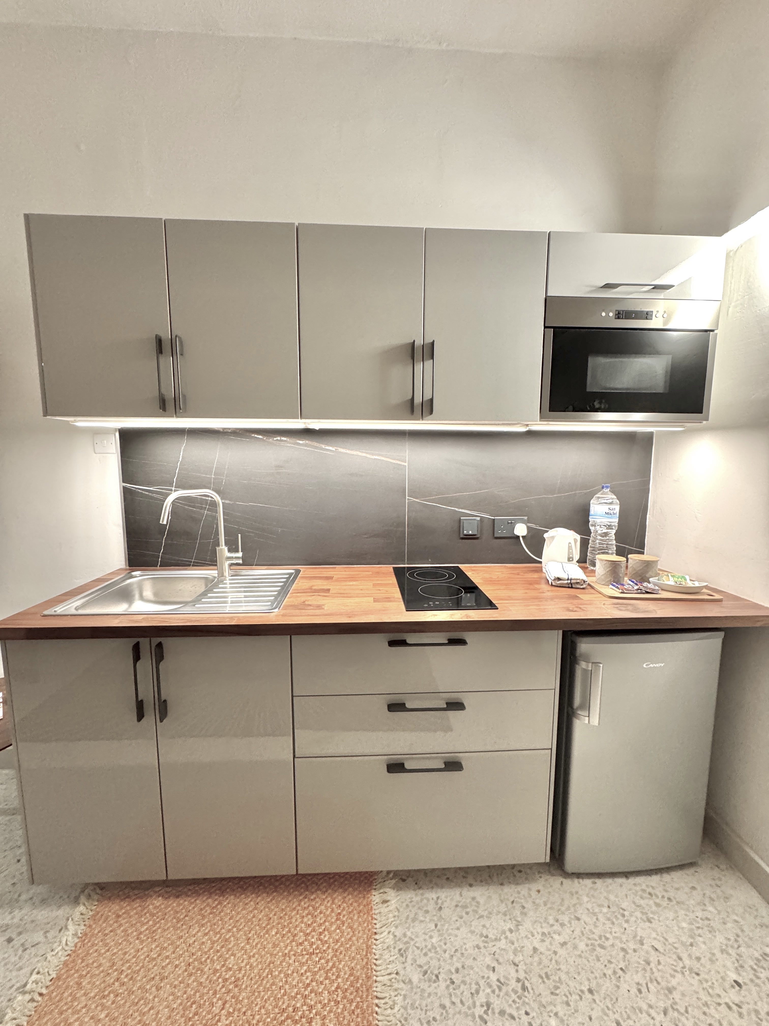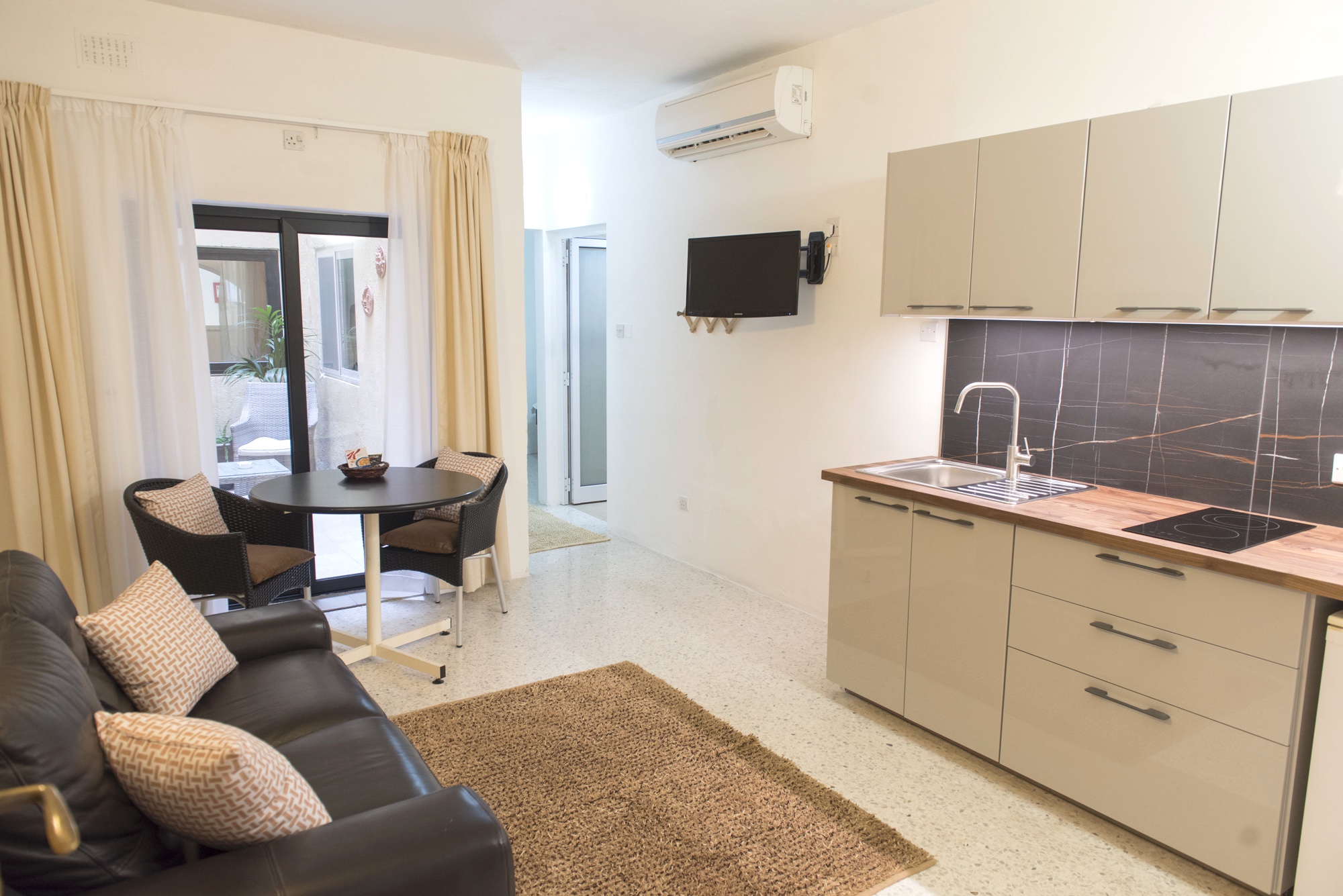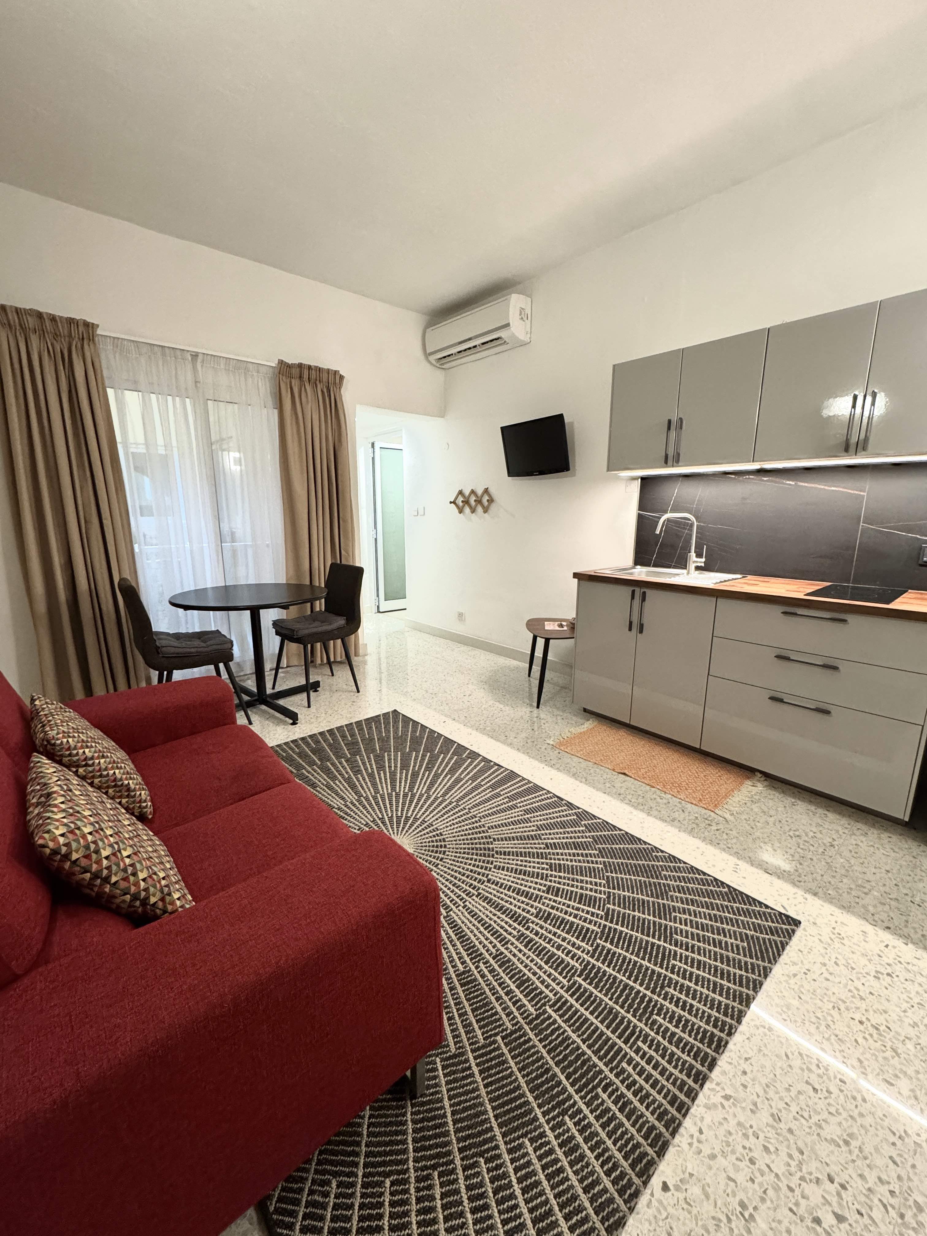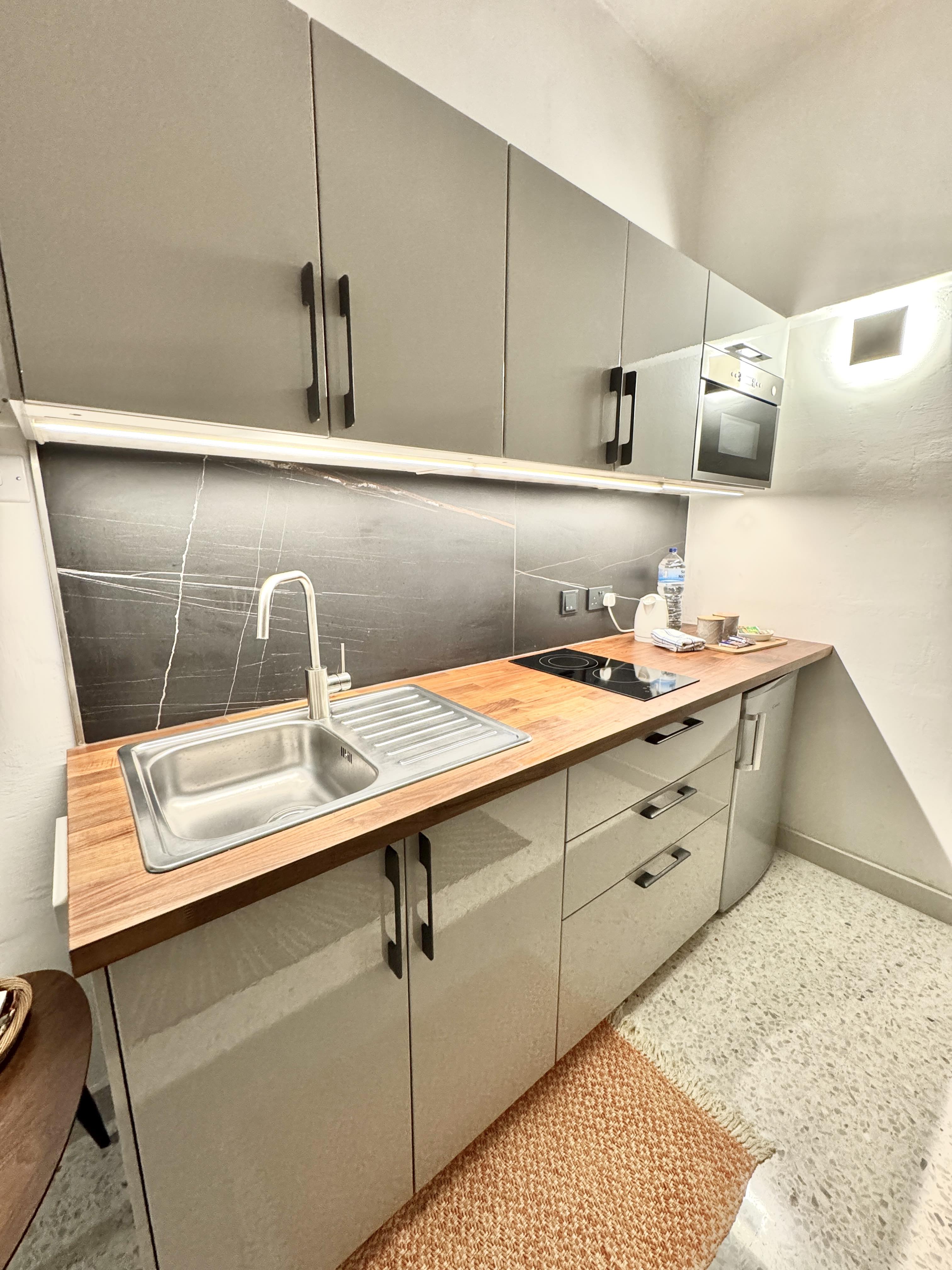 Our one bedroom apartments have a living room with a small kitchen, and a shower room.
